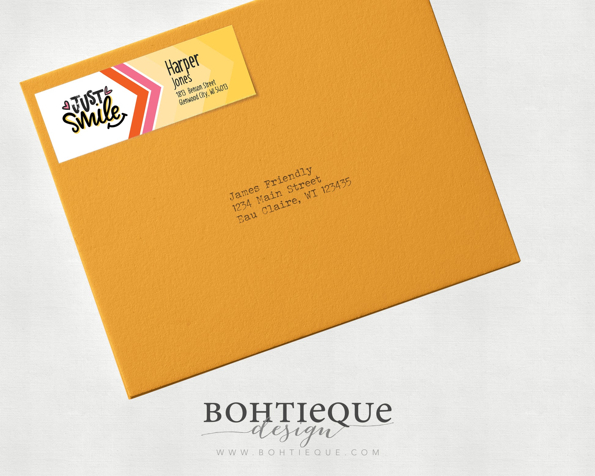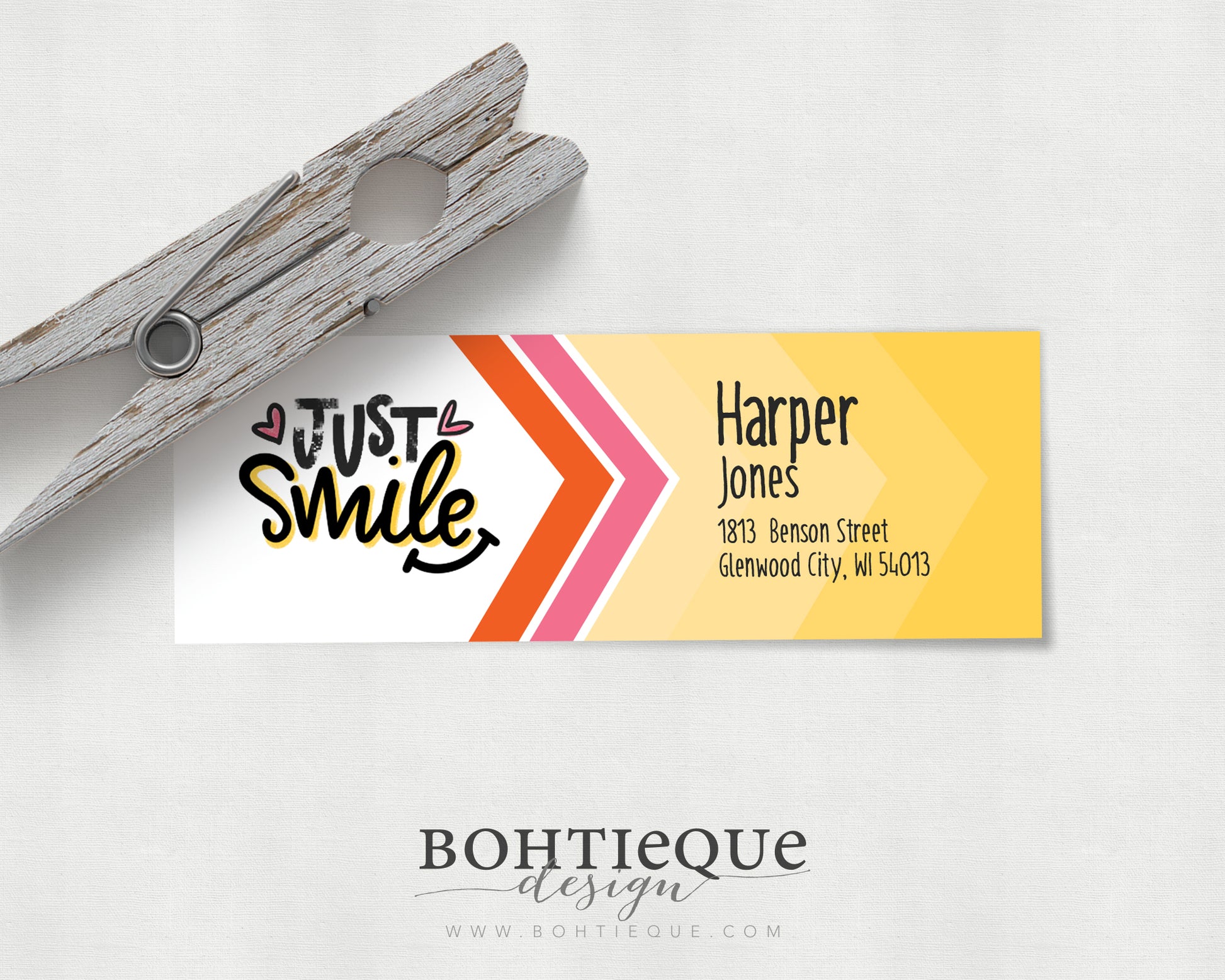 Put a smile on a friend's face with these amazing return address labels. "Just Smile" is hand-lettered, and the address text uses simple type. Choose a color for the solid background behind the names; the hand-lettered "Just Smile" graphic retains its bright pink and yellow accents.